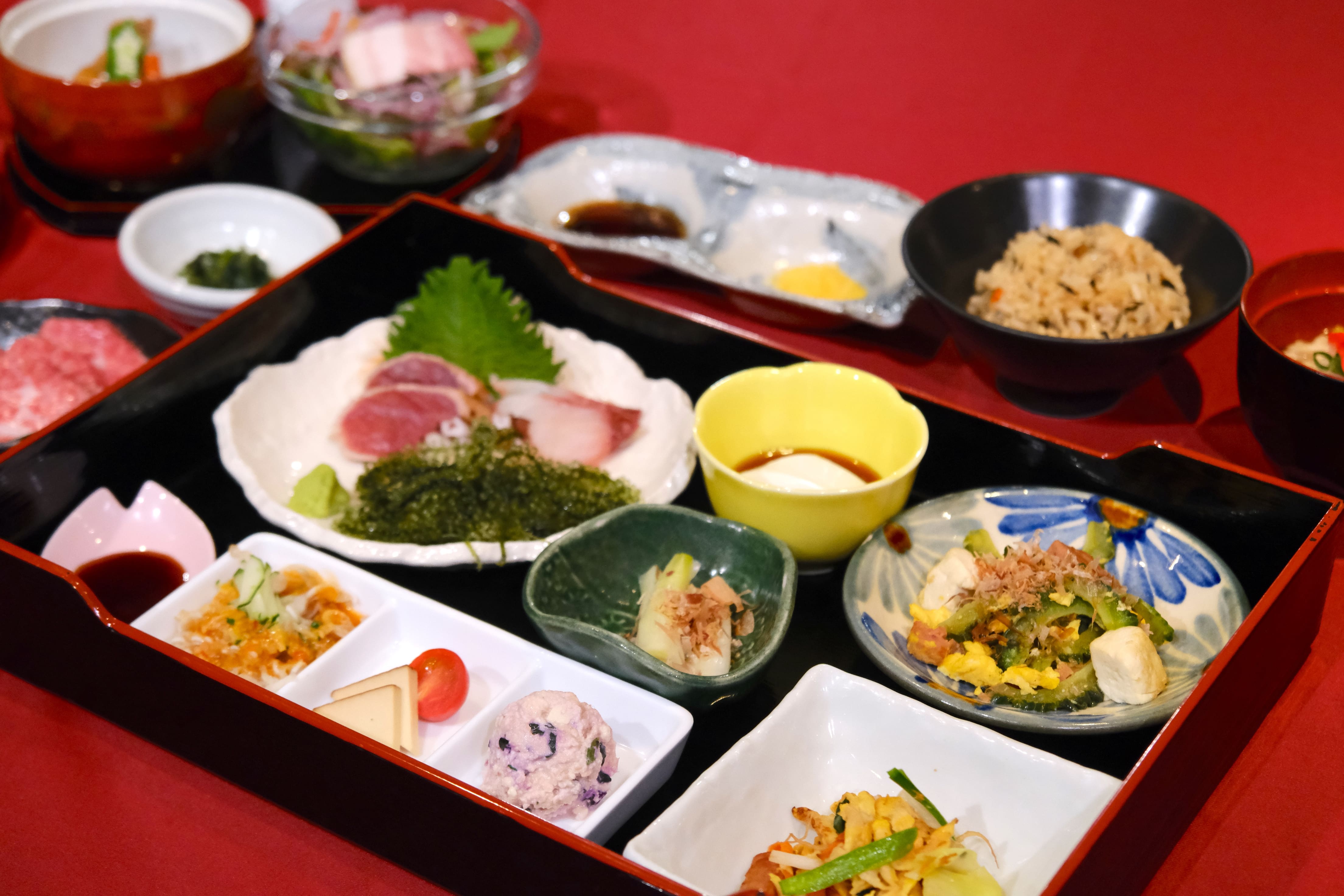 旅先で最も楽しみなことの1つといえば食事。ホテルに隣接する島唄と琉球料理・北谷ダイニングでは、三線の音色と島唄に酔いしれつつ、県産食材をふんだんに使った様々な沖縄料理を堪能できる。