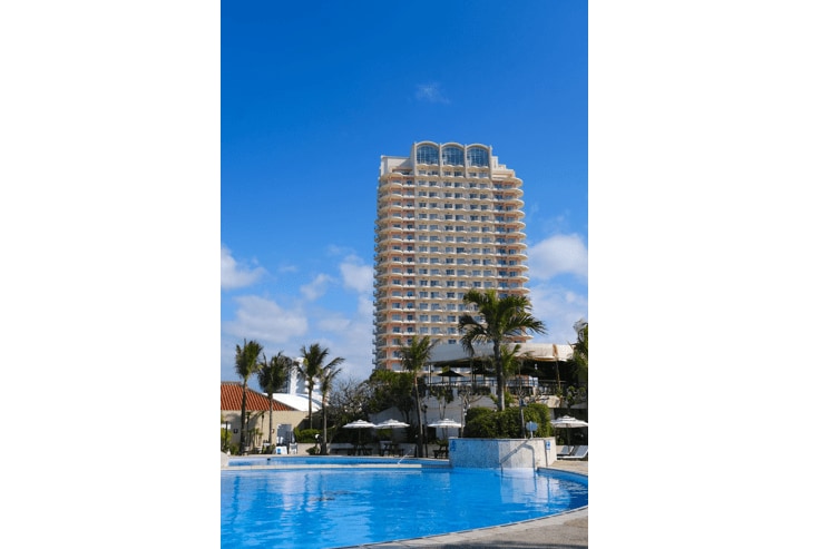 そんなエリアの一画にあるホテルが「ザ・ビーチタワー沖縄」。青と白のコントラストがまぶしいビーチのすぐそばにドーンとそびえ立つその姿は、今やリゾートタウン・北谷のランドマークの1つと言っても過言ではないくらいにこの場所に馴染んでいる。