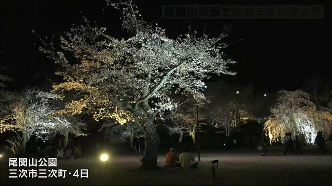 三次市三次町の尾関山公園では、ソメイヨシノや枝垂れ桜などおよそ600本が、LEDライトに照らされています。この日は、たくさんの人が公園を訪れ、写真撮影やお花見を楽しんでいました。