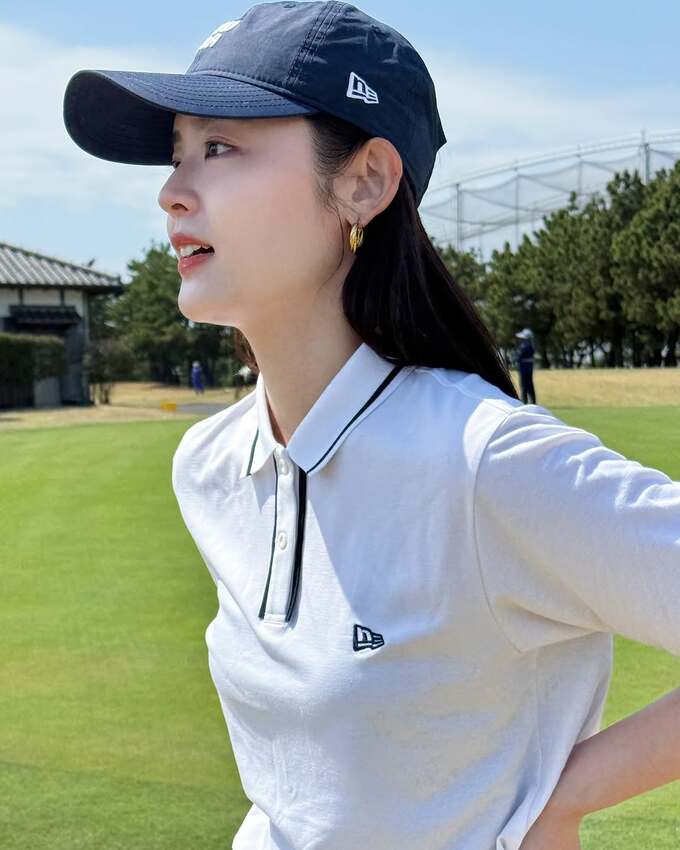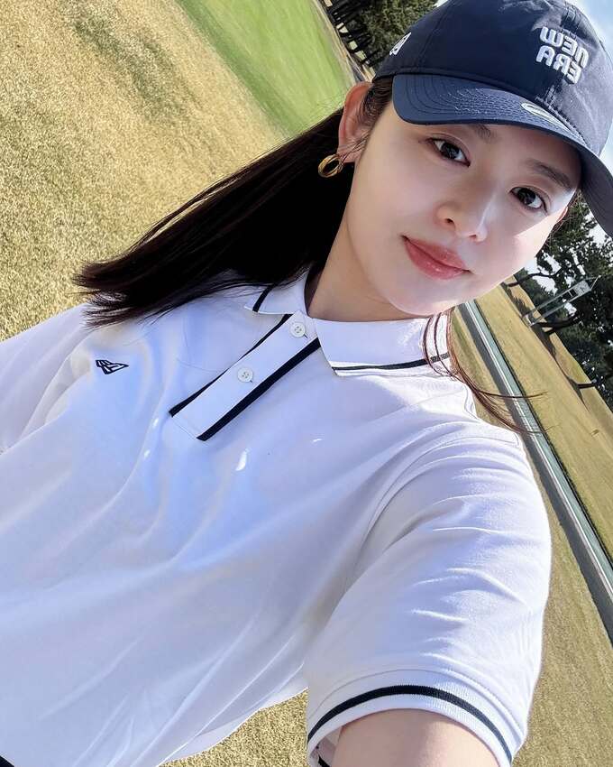 投稿された写真には、ゴルフ場で白いポロシャツにネイビーのミニスカート、ネイビーのキャップに膝上までのハイソックスが写った全身ショットや自撮りでほほ笑む写真などを公開しました。