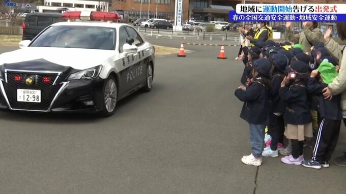 式の後、事故や犯罪の防止を呼びかける青色回転灯を付けたパトロール車両およそ40台が出発し、参加者が手を振りながら見送りました。