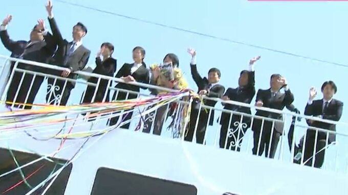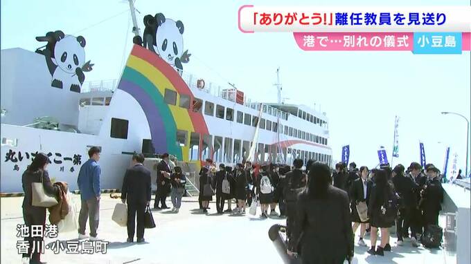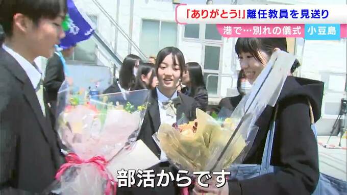 人事異動で島を離れる教員を、生徒たちが港で見送りました。