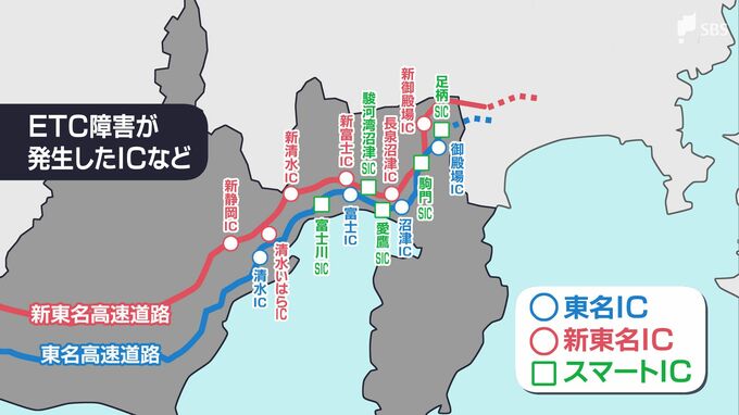 静岡県内では、新たに東名の御殿場ICと沼津IC、新東名の新御殿場ICでETCが利用できない状況に。県東部を中心に静岡県内10のICと5つのスマートICに影響が及びました。
