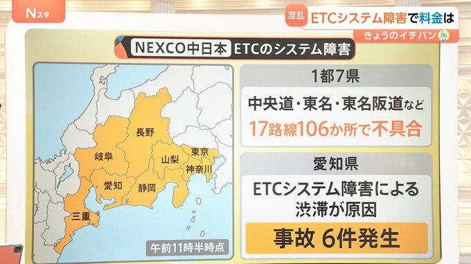 ETCのシステム障害は、1都7県におよびました。中央道・東名・東名阪道など17路線106か所で不具合が起きました。