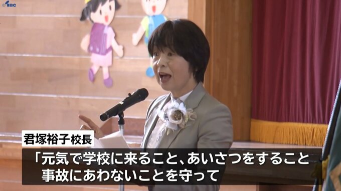 式では君塚裕子校長が「元気で学校に来ること、あいさつをすること、事故にあわないことを守って楽しく元気に学校に来てください」と新入生に呼びかけました。