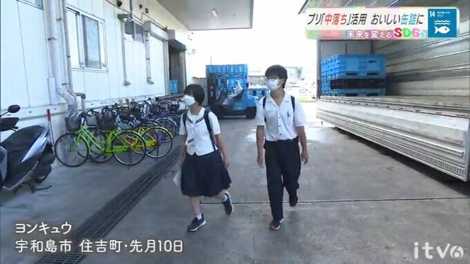 愛媛県立長浜高校の増田温樹(はるき)さん(3年)と重松そら(2年)さん。9月、2人は愛媛県宇和島市内にある魚の加工場を訪れていました。