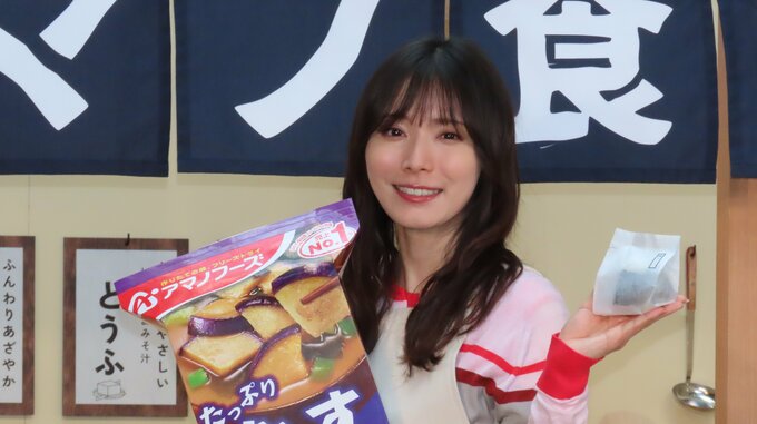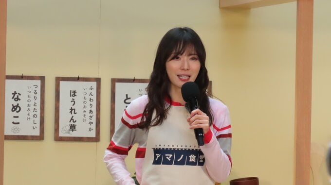 今回、松岡さんは「アマノ食堂」の「一日女将」としてポップアップイベントでスタッフが実際に着用するエプロンを付けて登場。「余すところなくおみそ汁の魅力をお伝えできれば」と気合十分だった松岡さんは、女将として「のれん掛けセレモニー」や、一足先におみそ汁の調理を行って、おにぎりを食べ一足先に「アマノ食堂」を楽しみました。