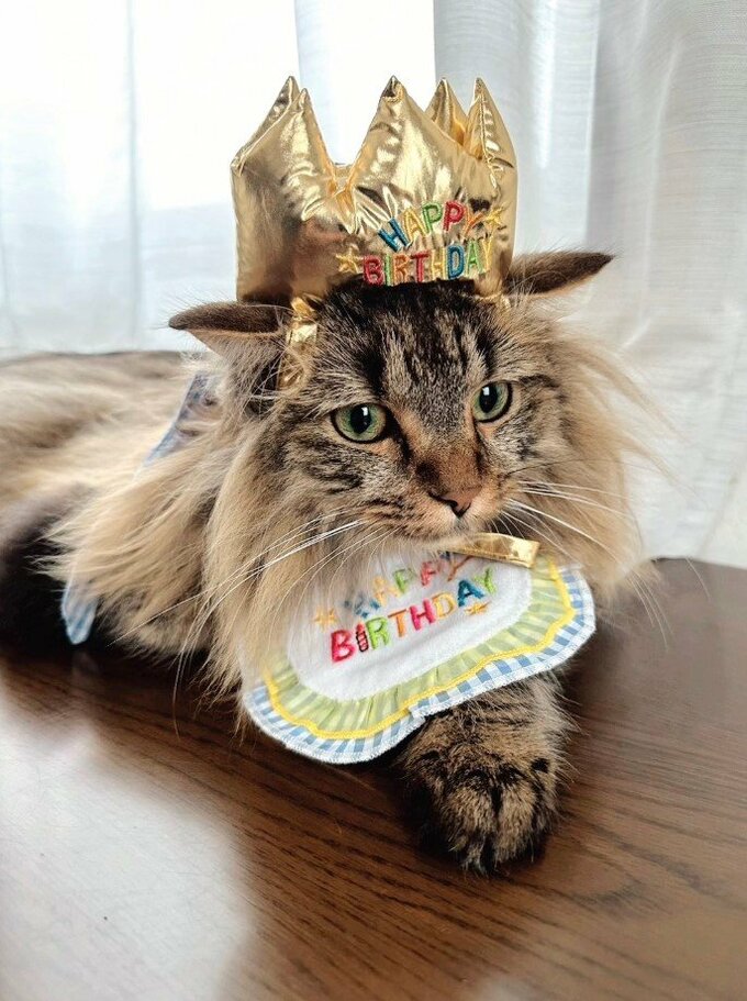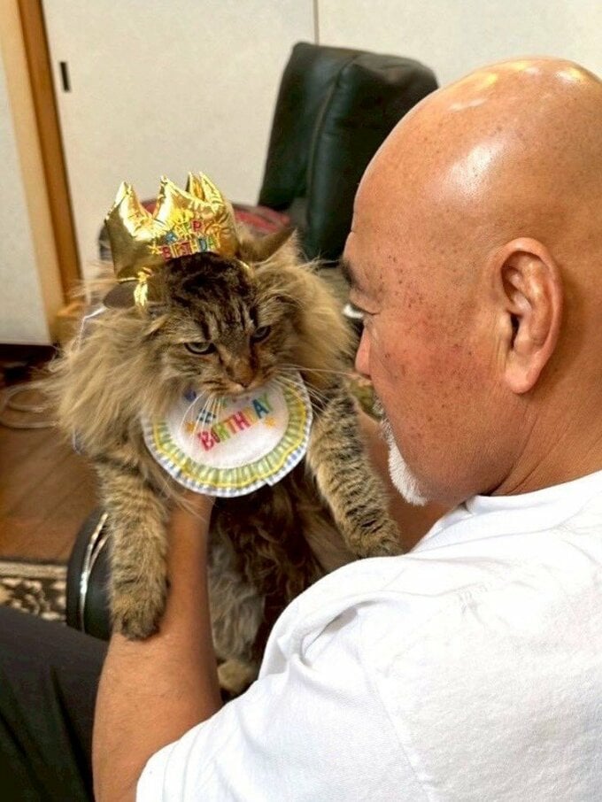 「今日は我が家の猫の1歳の誕生日」と武藤さんが微笑みながら抱き上げているのは、砂色と黒の縞の長毛種で、名は「ルビー」とのこと。ルビーは、チャンピオンの愛猫らしく黄金の冠をかぶり、「HAPPY BIRTHDAY」と刺繍されたスタイを首にかけています。