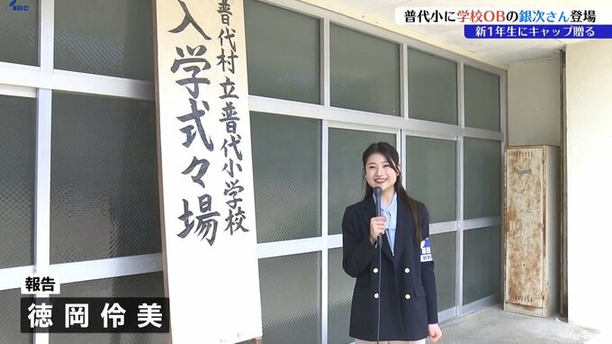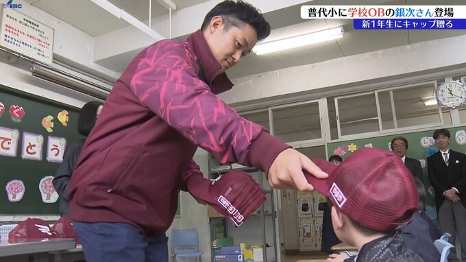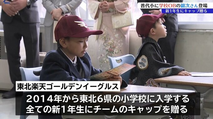 岩手普代村の小学校では、入学式に合わせてOBでもあるプロ野球・楽天のアンバサダー、銀次さんが学校を訪れ、新入生にチームのキャップを贈りました。