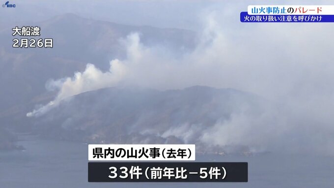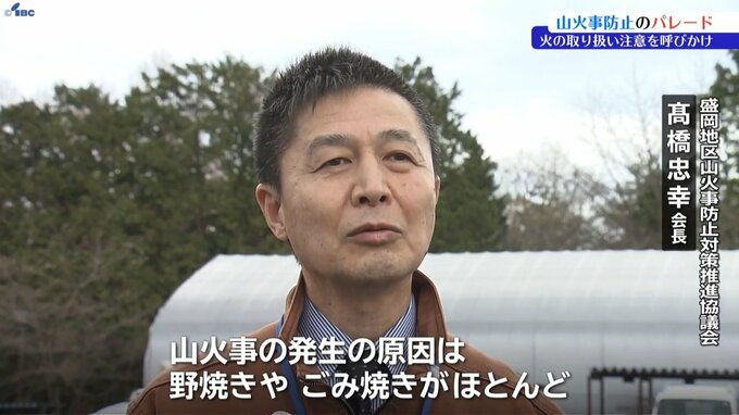 そんな中、矢巾町などで8日火の取り扱いへの注意を呼びかけるパレードが行われました。矢巾町など盛岡広域の7つの市と町で行われたパレードには、森林管理署や消防署の署員など70人が参加しました。