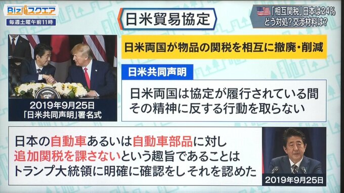 共同声明には【日米両国は協定が履行されている間、その精神に反する行動を取らない】とあり、安倍元首相も当時会見で、「日本の自動車あるいは自動車部品に対し、追加関税を課さないという趣旨であることはトランプ大統領に明確に確認をし、それを認めた」と話している。