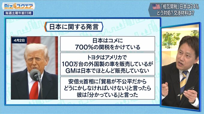 また、トランプ氏が2日の会見で口にした「安倍元首相に『貿易が不公平だから、どうにかしなければいけない』と言ったら、彼は『分かっている』と言った」という発言にもヒントがあるという。