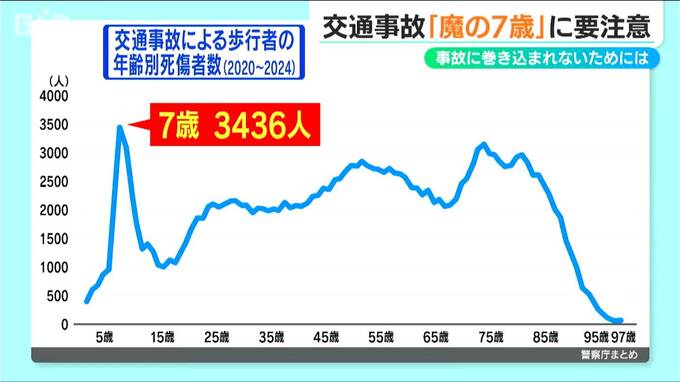 2024年までの5年間に交通事故で被害にあった歩行者の件数を警察庁が年齢別にまとめたグラフによりますと、7歳が3436人で“最も多い”ことが分かります。