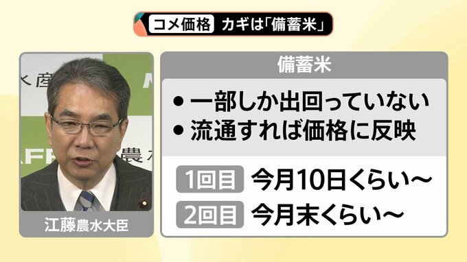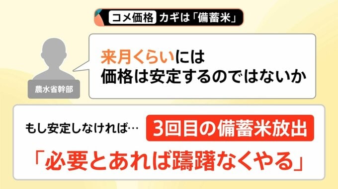 農水省幹部は、「カギは備蓄米」としています。3月に2回にわたって備蓄米の入札・落札が行われ、これから2回目の放出されていきますが、まだ落札された備蓄米の一部しか出回っていないので、価格が高止まりしてると言われています。