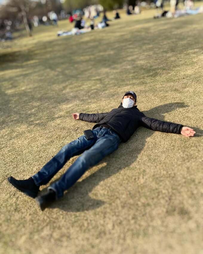 遠藤さんは「新宿御苑です!」と一言だけテキストして写真を投稿。黒のジャケットにデニムを合わせて、芝生の上に腕を広げ脚を伸ばして寝そべっていて、マスクの下は間違いなく笑顔だろうと思えるほどに、目がほころんでいます。