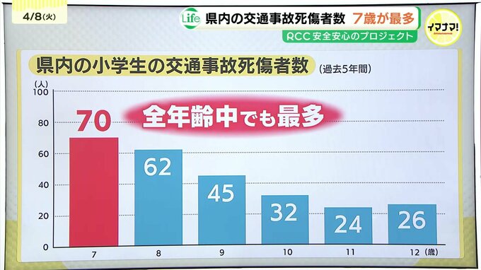 広島県内で去年までの5年間に起きた、小学生の交通事故死傷者数です。「7歳・小学1年生」が最も多く70人、次いで多いのが8歳と、低学年ほど交通事故の死傷者数が多いことがわかります。小学生の中での全年齢をみても、交通事故の死傷者数は「7歳」が最多なんです。