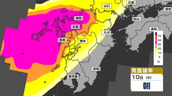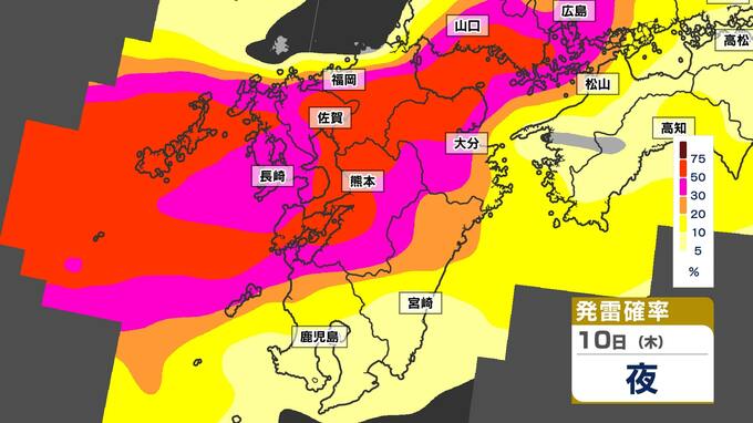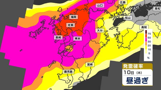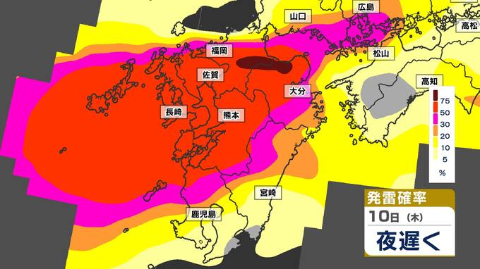 【花散らしの雨】九州 天気下り坂 あす明け方から雨 雷が鳴るところも【雨はいつからいつまで?】雨・発雷確率のシミュレーション10日(木)福岡・佐賀・長崎・大分・熊本・宮崎・鹿児島 南日本放送 2025年4月9日(水) 18:00 国内 天気 【発雷確率】のシミュレーション 〈発雷確率〉つまり雷の発生確率は、大気の状態の目安になります。確率が高ければ〈大気の状態が不安定〉で、それだけ〈急な強い雨〉や〈雷〉〈ひょう〉が発生する可能性が高くなります。画像で確認できます。