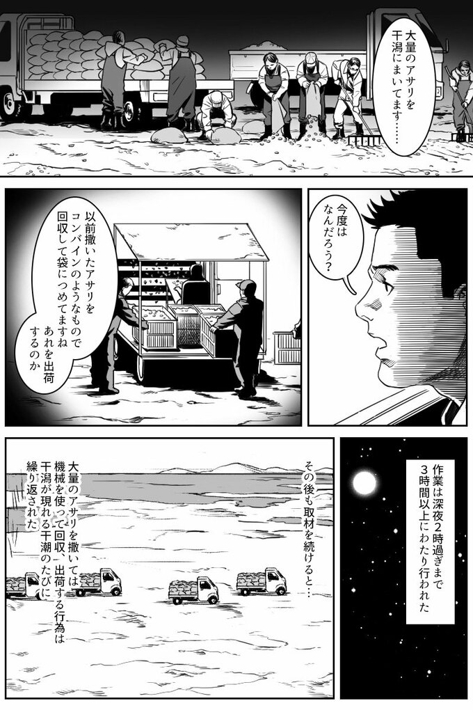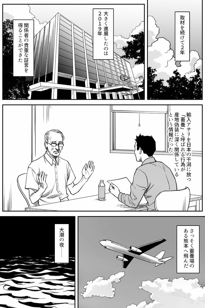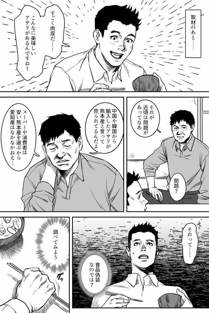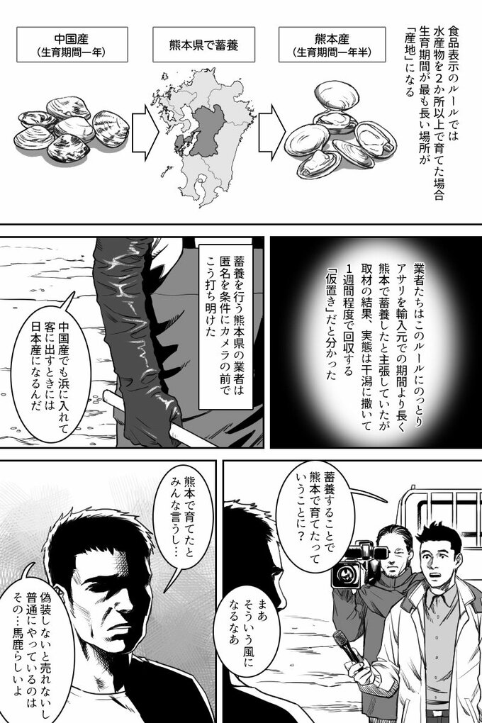 コミック DIG 「中国産でも客に出すときには日本産になる」 アサリ産地偽装 日本中を巻き込んだ大規模不正の実態 【コミックDIG #4】 CBCテレビ 2022年10月22日(土) 10:00 国内 私たちが“熊本産”だと信じて食べてきたアサリのほぼ全てが、実は“中国産”だった。 巧妙な手口で中国産を国産にすり替える大規模なアサリの産地偽装が横行していました。追跡取材で、その実態が明らかになりました。 (※後編も鋭意制作中です)