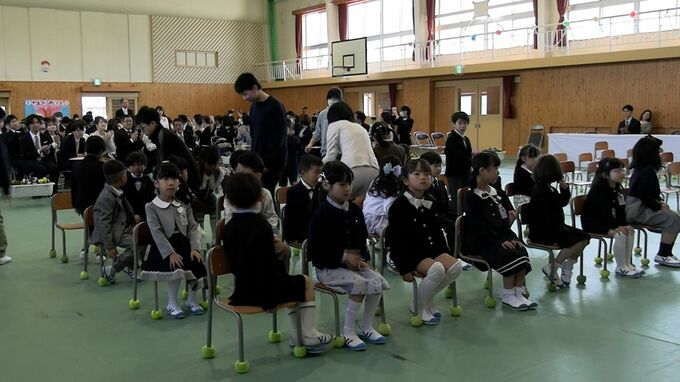 6年生と手をつなぎながら新入生が入場です。岡山県津山市ではきょう(9日)すべての公立小学校、27校で入学式が行われました。このうち51人が入学した東小学校では影山哲也校長が「ひとりでできることを増やし、挨拶もがんばりましょう」などと述べ新入生を歓迎しました。