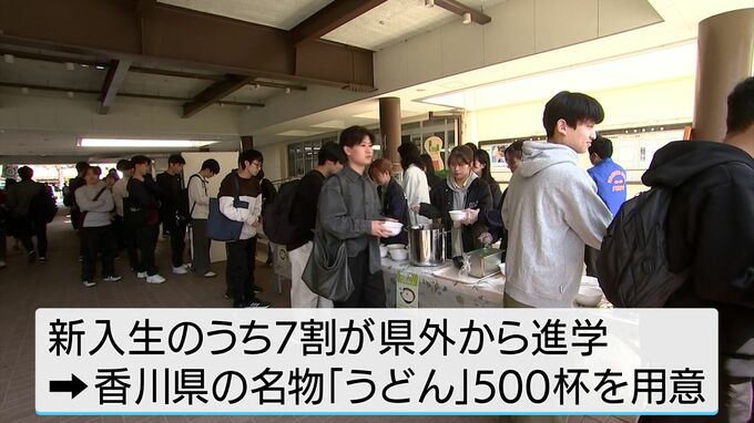 新入生のうち7割が県外からの進学ということで、香川県の名物に親しんでもらおうと、500杯のうどんが用意されました。香川らしい歓迎も受けた新入生たち。それぞれ、大学での初めてのイベントを楽しんだようです。