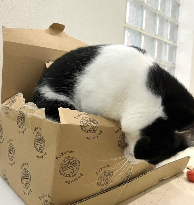 藤さんは1枚目に、先日タンスの中を掘り返していたマルにも負けないくらいの勢いで、箱の中に身体を突っ込んで掘り返している元気なオレオの写真を投稿。