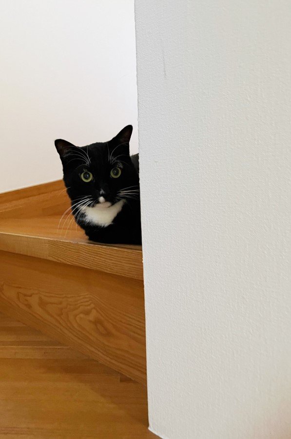そして3枚目には、階段の曲がり角からオレオを見ているであろうマルの姿が。マルは香箱の形で座り込み、壁の切れ目から顔の幅の分だけを出してじっと見つめていて、人気テレビドラマに登場する家政婦さんのような雰囲気です。