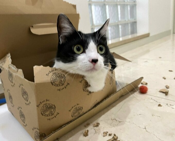 2枚目で、オレオは破れた箱の破片が飛び散っている床を背にして箱に収まり「何か?」という無心な表情でこちらを見つめています。