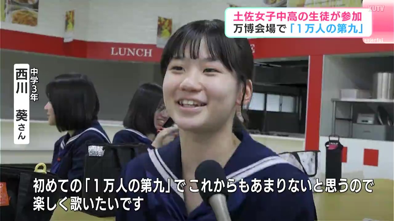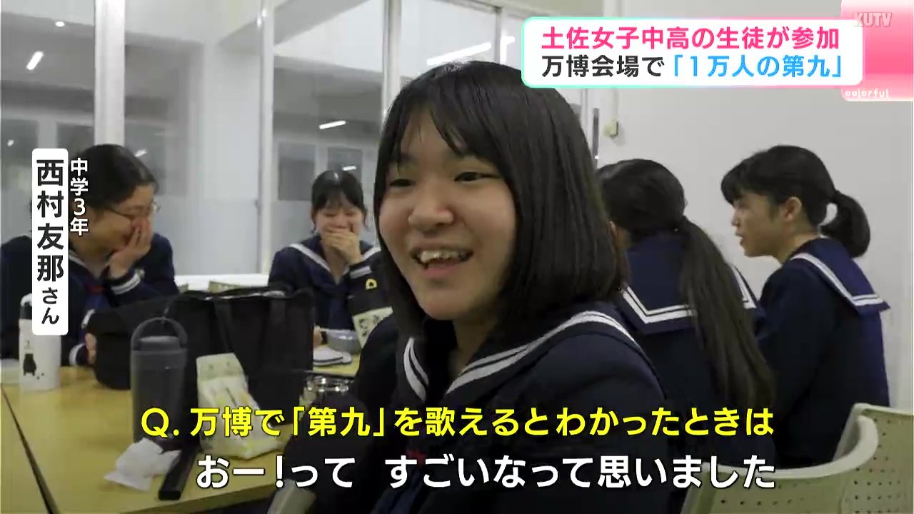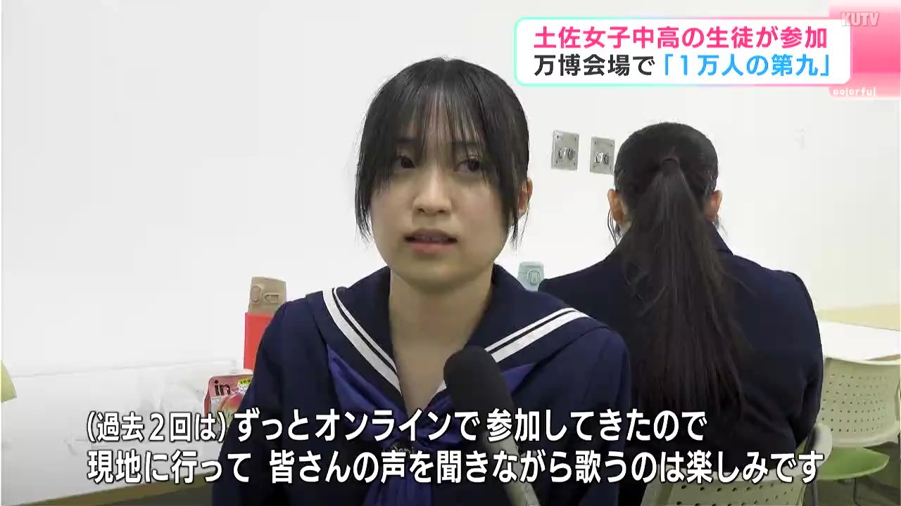 「まず万博に行けることにすごくびっくりして、その中でも今まで歌ってきた「第九」を歌うのは、とにかくびっくりしました。(土佐女子コーラス部として)初めて現地に行くので、とても誇らしい気持ちです。(過去2回は)ずっとオンラインで参加してきたので、現地に行って、皆さんの声を聞きながら歌うのは楽しみです」
