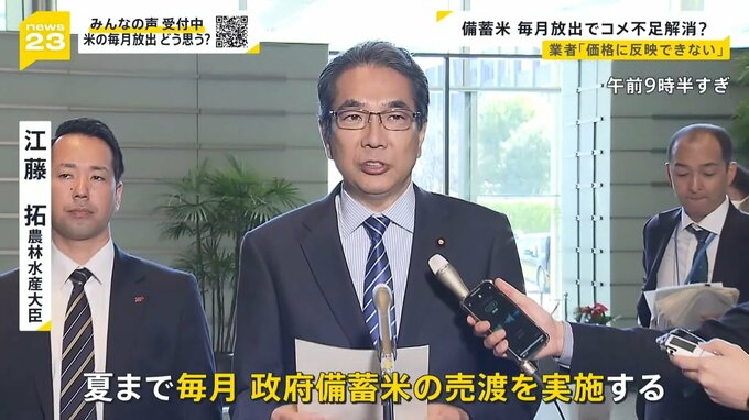「上昇したコメの価格を落ち着かせるため、夏まで毎月政府備蓄米の売渡を実施する。コメが足りないという状況は、備蓄米を放出することによって解消する」