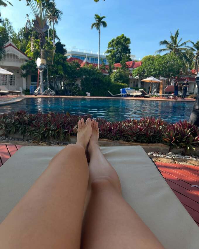 さらに、プールサイドのデッキチェアーでくつろぐ様子や室内で腕を組んだ写真、白のタンクトップ姿で鏡を使って自撮りした写真などを投稿。