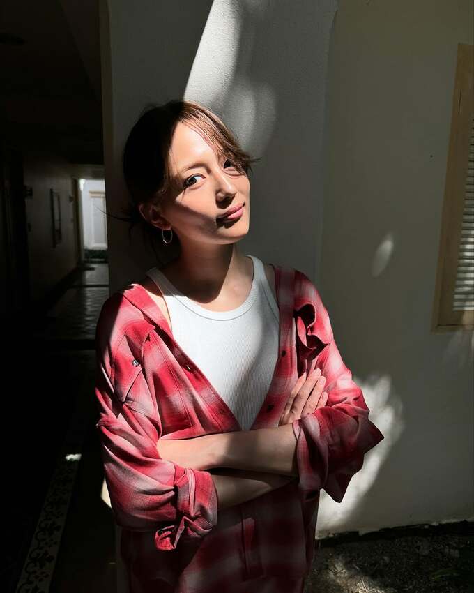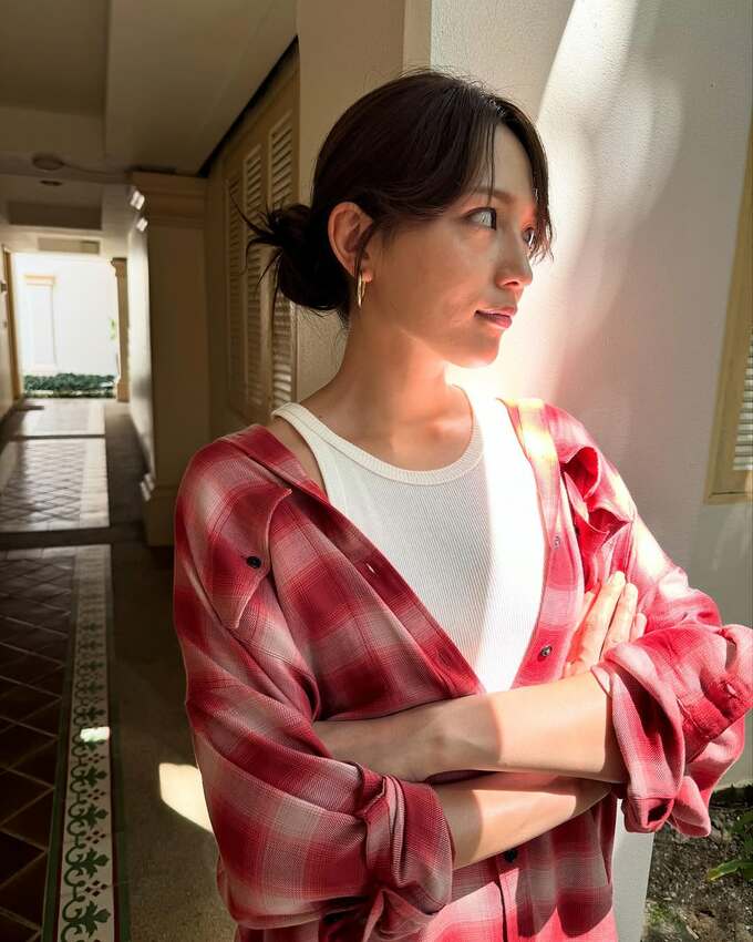 1枚目の写真には、白いタンクトップに赤と白のチェック柄シャツを羽織ったカジュアルなスタイルで登場。青い空と水平線が広がり、緑色の旗が風になびく美しい海辺を背景にカメラに向かってほほ笑む姿の写真を投稿しています。