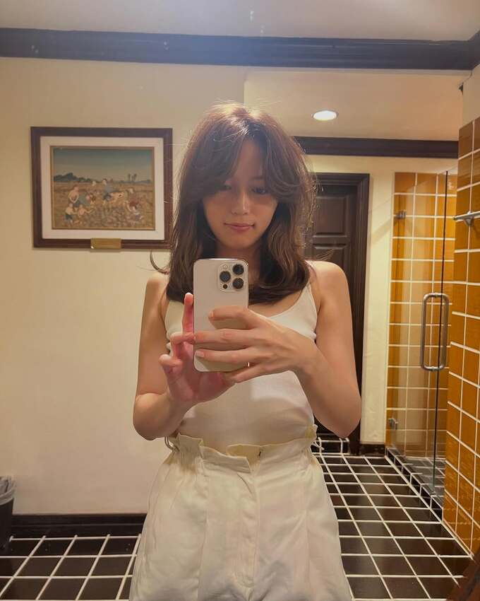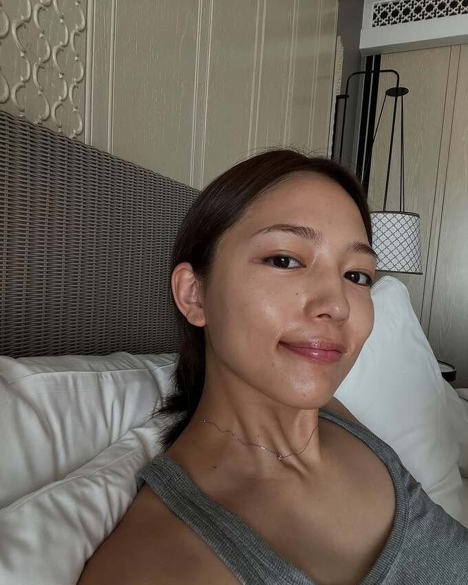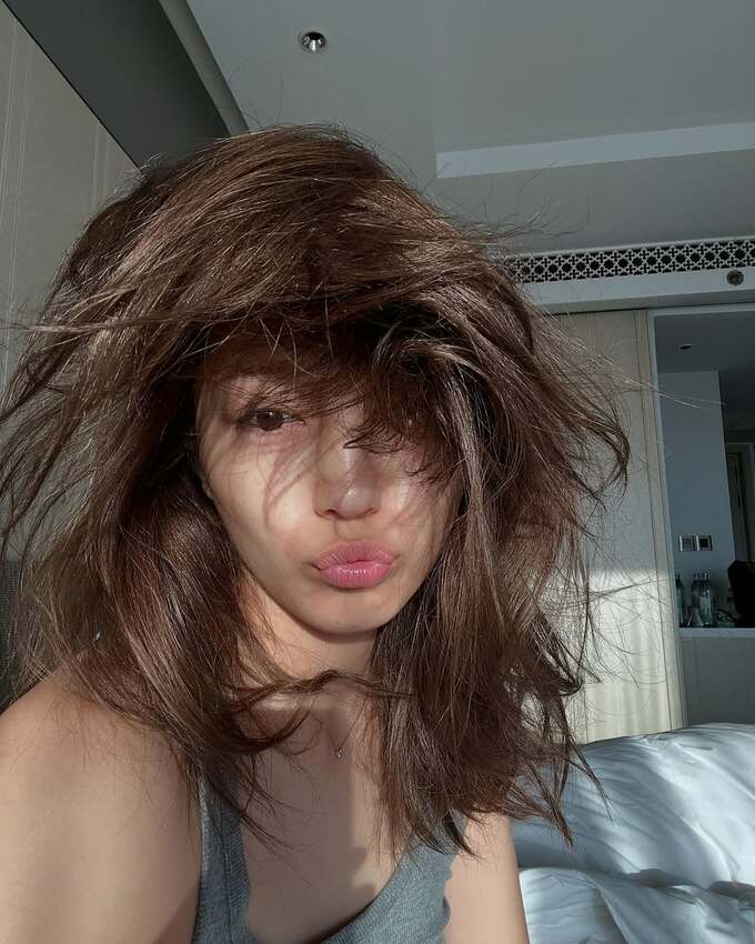 また、ベッドの上で自撮りした写真では、グレーのタンクトップ姿にボサボサの髪を披露した写真も投稿しています。