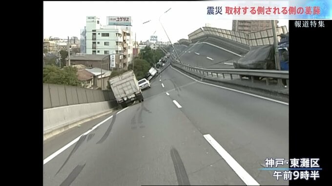 「ここは西宮市の夙川の駅前です。私の後ろにありますように、マンションが、ほとんど倒れてしまっています。出入口は完全にふさがっておりまして、皆さん窓から出入りしておられるような状態です」