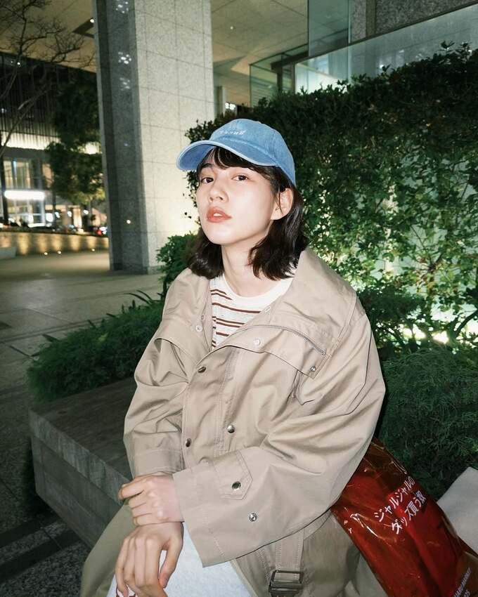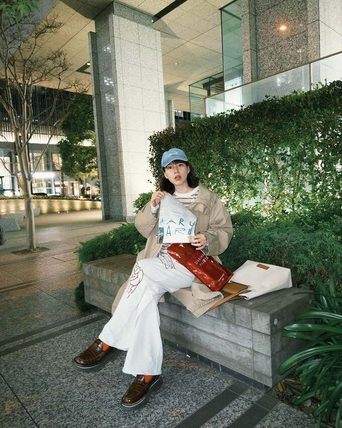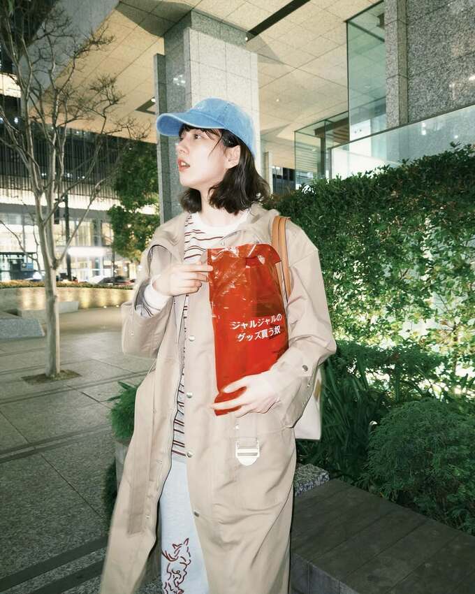 のんさんは、デニムのキャップにエンジのボーダーが入った白の長袖Tシャツ、馬のプリントが入った白のパンツにトレンチぽいカーキ色のレインコートを羽織り、夜の街を散歩するような写真を投稿。おもむろに街路の花壇に腰かけて、戦利品を出しているその袋には「ジャルジャルのグッズ買う奴」とプリントされています。
