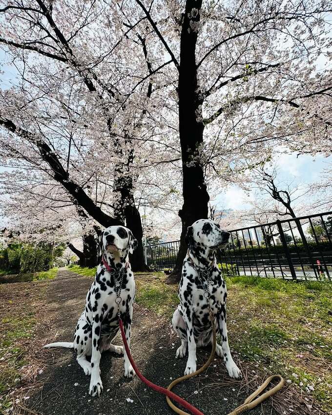 高岡さんは、愛犬のダルメシアン2頭が桜の樹の下で姿勢良く “お座り” ポーズを取っている様子を投稿。「お花見日和ですね」「早朝、あまり人が出ていない時間に」「愛犬と共にお花見のんびり散歩」と綴っています。