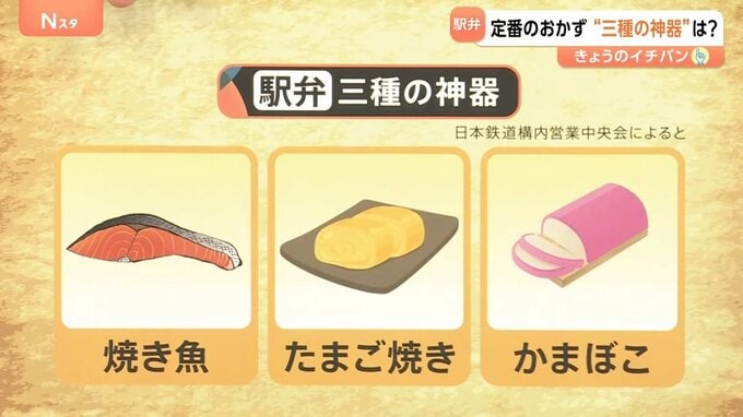 日本鉄道構内営業中央会によりますと、「焼き魚」「たまご焼き」「かまぼこ」が駅弁定番のおかずで、『三種の神器』だといわれているということです。
