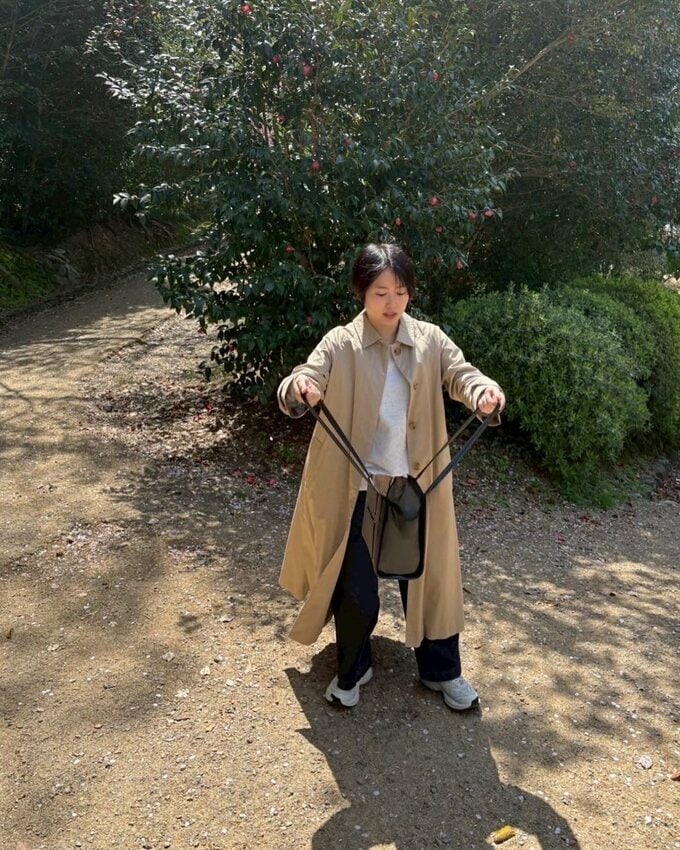 志田さんは、咲き誇る桜の花のアップ写真を投稿しつつ、別の写真では、トートバッグの持ち手を大きく開いて立ち、バッグの中を真剣に見つめている様子を2枚投稿。