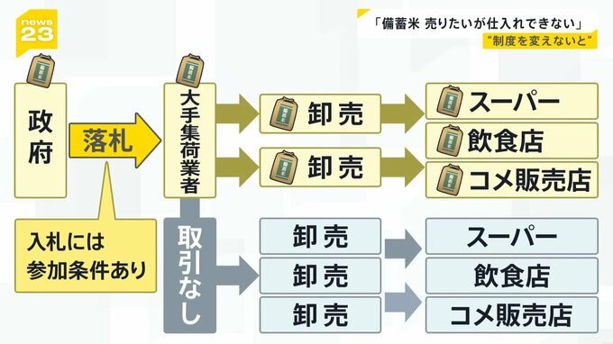 政府の備蓄米は、まず入札に参加し落札した集荷業者の元へ。その後、卸売業者を経由してスーパーや飲食店、コメの販売店などに並びます。取引ルートにこうした集荷業者や卸売業者がない店は備蓄米が入ってきません。