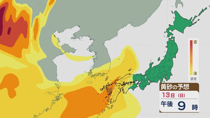 【黄砂情報】大陸からの黄砂が13日(日)に九州から近畿に 14日(月)は東海や関東など東日本にも飛来する予想に 最新のシミュレーション 北陸放送 2025年4月11日(金) 09:44 国内 13日(日)から14日(月)にかけ、西日本から東日本で黄砂が飛来する見込みです。 大陸で飛んでいる黄砂は13日朝には東シナ海に達し、日中から夜にかけては九州や中国・四国で飛来する見込みです。