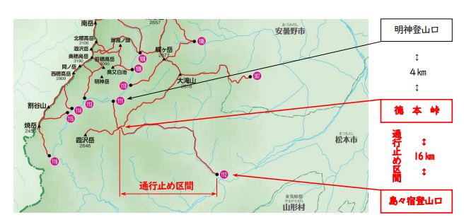 通行止めになっているのは、松本市安曇の島々地区の登山口から徳本峠(とくごうとうげ)を通って上高地の明神に通じる、全長20キロの登山道「島々明神線歩道」の内、島々宿登山口から徳本峠までの16キロの区間です。