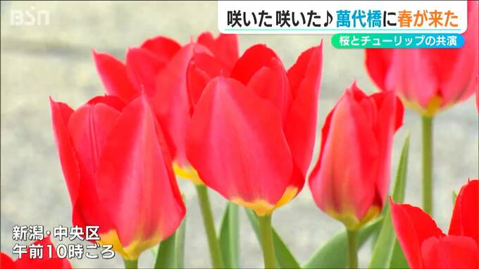 萬代橋を彩るおよそ2万5000本のチューリップは新潟市の小中学や企業など428の個人や団体が大切に育てたものです。