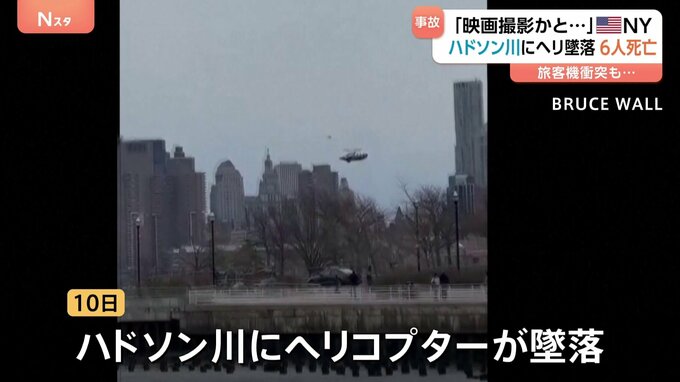 アメリカでまた航空機の事故です。ニューヨークのハドソン川ではヘリコプターが墜落し、子ども3人を含む6人が死亡しました。猛スピードで落ちる物体。上下逆さまになったヘリコプターです。プロペラも回転しながら…