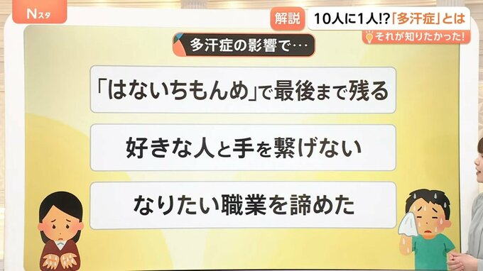 「はないちもんめ」で手汗がひどいので、なかなか選んでもらえず最後まで残ってしまった、好きな人と手を繋げない、なりたい職業を諦めたという人もいました。中には、教員になりたかったけれども、子どもと接する機会が多かったり、プリントを触る機会も多いので、なれなかったという人もいました。