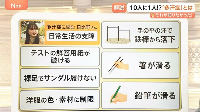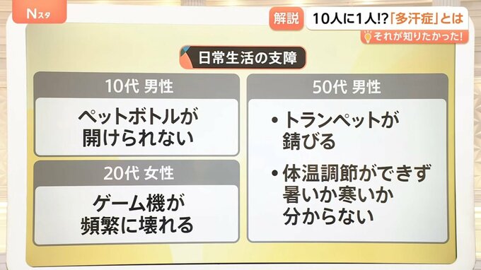 多汗症という病気は、汗が多く出る病気だと徐々に広まりつつはありますが、日常生活のどういった場面で支障が出ているのかというのは、なかなか想像が難しい部分があると思います。