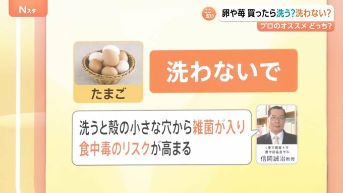 元東京農業大学農学部畜産学科 信岡誠治教授は「洗わないでください。洗うと殻の小さな穴から雑菌が入り、食中毒のリスクが高まる」といいます。