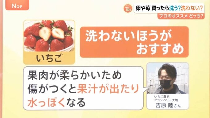 さらに苺も『洗わない方がおすすめ』なんです。いちご農家「グランベリー大地」の吉原陸さんは「果肉が柔らかいため傷がつくと果汁が出たり水っぽくなる」といいます。