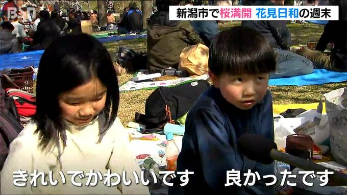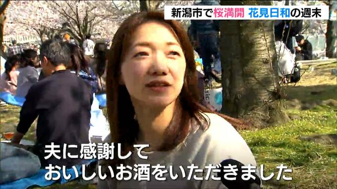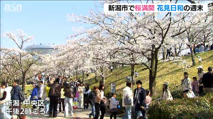 新潟市で桜の満開が発表されて最初の週末。桜が見頃の公園は、花見客でにぎわいました。