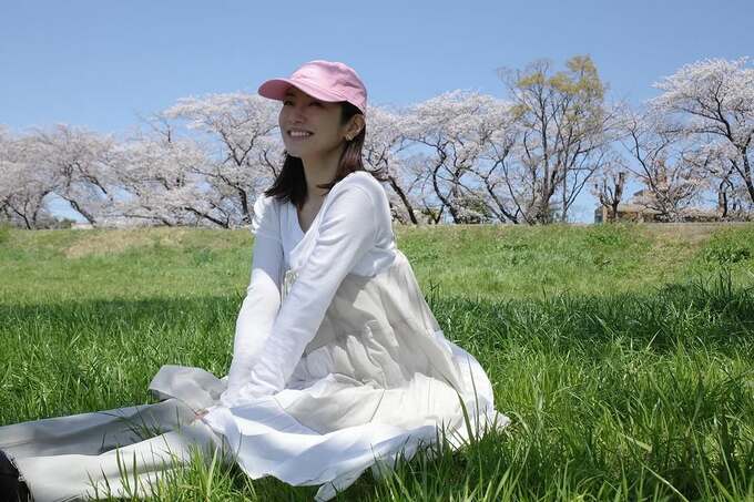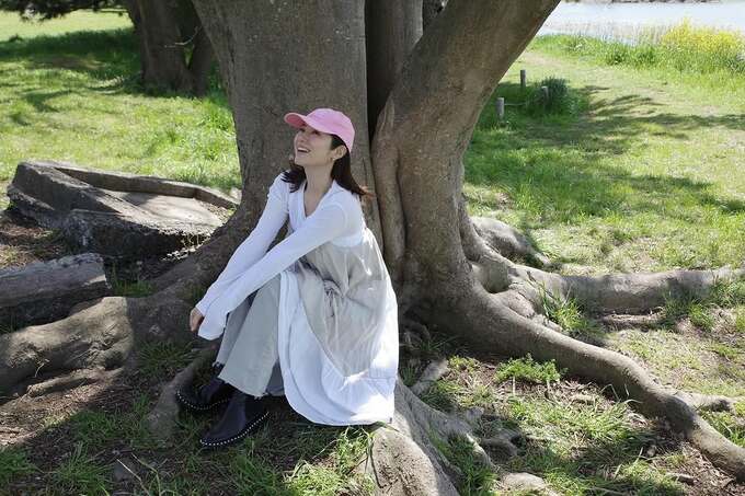 内山さんは「今週は桜を見に家族でピクニック」と、晴れた日の模様を投稿。川沿いと思われる場所に大きな根を張る大木の木陰に入ったり、緑いっぱいの下草に座り込んだりして、春の陽気を堪能する内山さんは、白のワンピースにグレーのパンツとレザーシューズを合わせ、ピンクのキャップをポイントにしています。