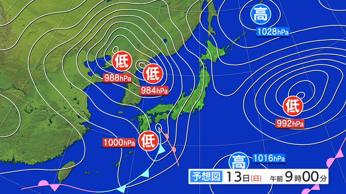 “多発する”低気圧で荒れる天気に 13日(日)は西日本から東日本で大雨のところも 土砂災害などに注意を 最新の雨と風シミュレーション 北陸放送 2025年4月12日(土) 20:40 国内 13日(日)は、朝鮮半島北部の低気圧による風の収束にともなう雨雲に加え、太平洋沿岸でも低気圧が通過し西日本から東日本の広い範囲で雨が降り、大雨になるところもありそうです。 13日午前9時の予想天気図です。朝鮮半島北部付近に低気圧が2つあり、四国の南付近にも前線をともなった低気圧があります。 13日(日)午前9時の予想天気図 四国付近の低気圧は東へと進み、西日本から東日本にかけて南から暖かく湿った空気がもたらされ、大気の状態が不安定になりそうです。