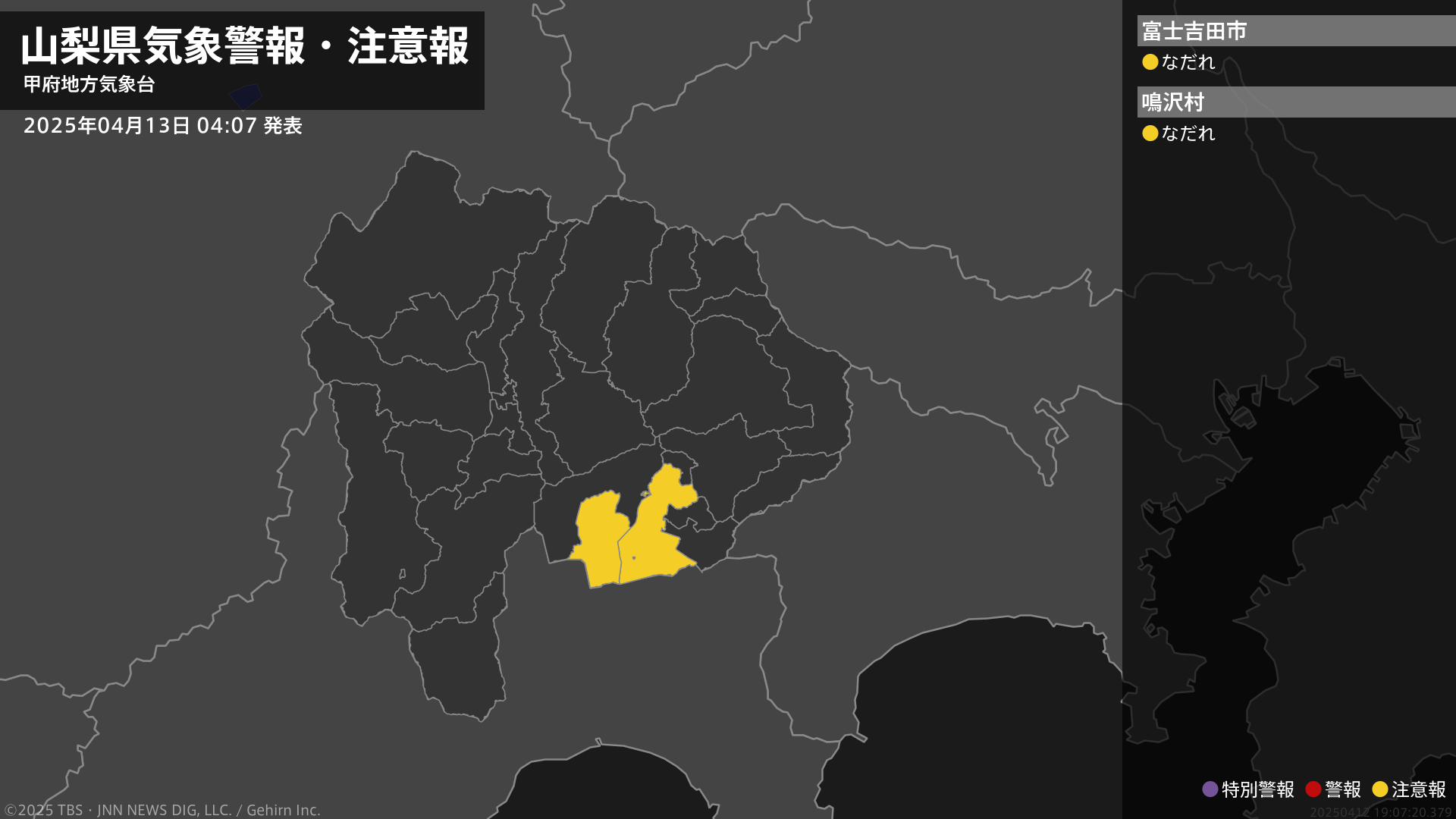 気象台は、午前4時7分に、なだれ注意報を富士吉田市、鳴沢村に発表しました。